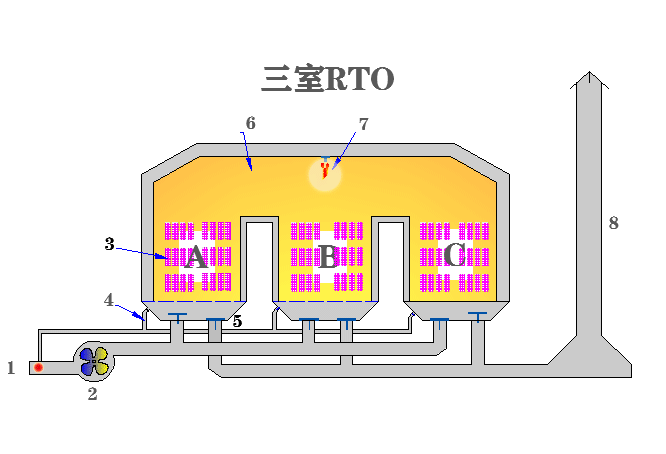 1 废气入口,2 主风机,3 陶瓷蓄热体,4 吹扫风管,5 提升阀,6 燃烧炉体,7 炉头,8 烟囱