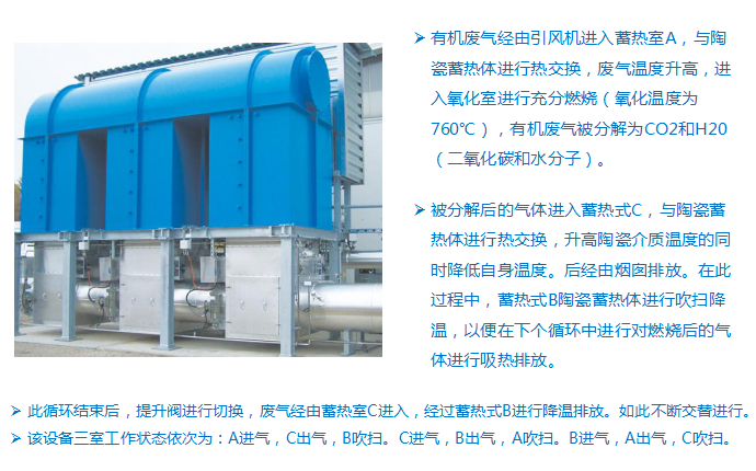 三室RTO设备可一次性彻底处理多种有机废气,包括:丙酮、甲苯、苯酚、二甲基苯胺、甲醛、正己烷、乙酸乙酯、乙酸丁酯,乙醇、丁醇、二甲苯、乙烯、丙烯、苯乙烯、丙烯晴、丁二烯等烯烃类、醛、酮、烃、脂肪酸、醇、酯、内酯、杂环化合物、芳香族化合物、非甲烷类总烃等。